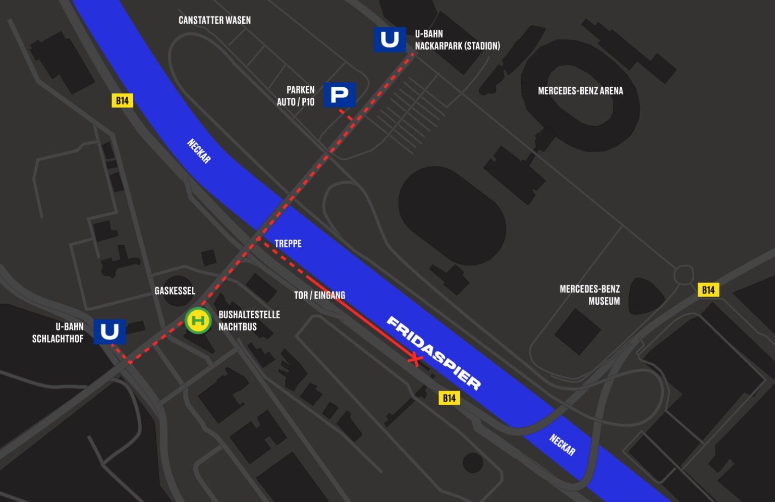 Anfahrt: Fridas Pier liegt direkt am Neckar. Wer mit der U-Bahn kommt, steigt an der Haltestelle „Schlachthof“ aus, überquert am Gaskessel die Straße (Richtung Großmarkt/MEGA) und folgt anschließend der Gaisburgerbrücke über die B10/B27. Die Treppen vor dem Neckar führen hinunter zum Ufer – von dort weist eine Lichterkette den Weg zum Pier. Das geöffnete Tor heißt euch herzlich willkommen.